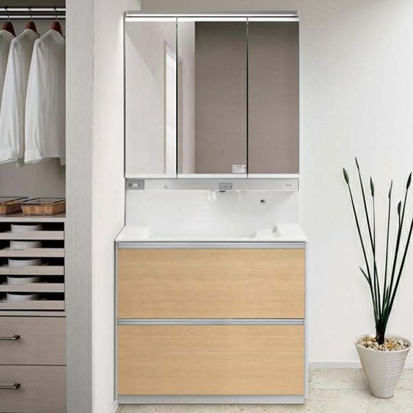 | 品番 | ①本体900 パノラマスライドタイプ 抗菌加工:GQD90EVSXTV ②タッチレス水栓(3面鏡用):XGQD90EB3N ③スリムLED3面鏡 抗菌加工:GQD090EWDBT |