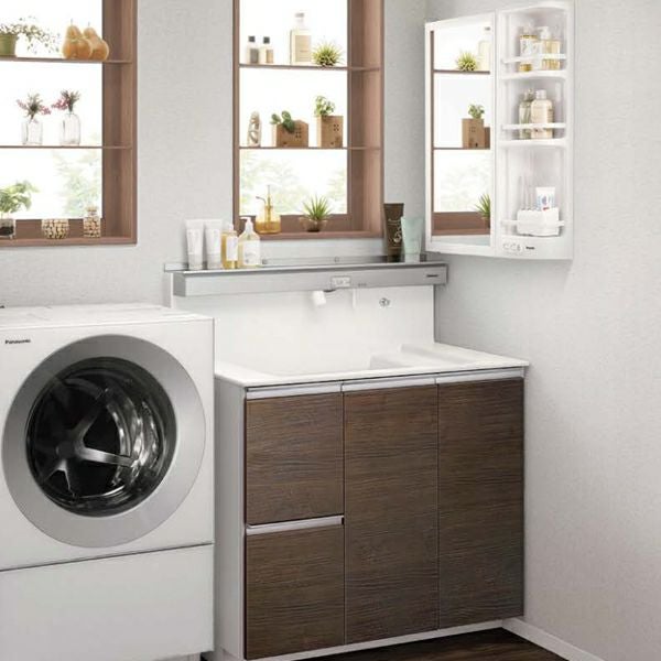 | 品番 | ①本体 900引出しタイプ 抗菌加工:GQD90EVHXTT ②タッチレス水栓(1面鏡用):XGQD90EB1N ③本体用アルミ棚:GQD90ATK ④横壁用両面ミラー直付けタイプ:GP32ML |