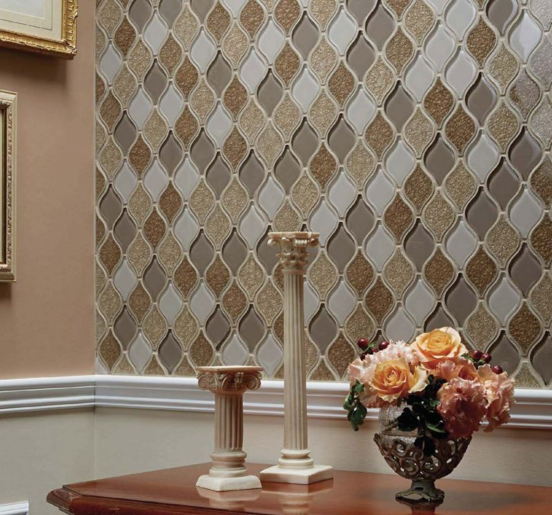 形状に特徴のあるガラスモザイクとタイルのミックス品です。落ち着いた色合いで、ノスタルジックな印象に仕上がります。設計参考価格:10,000円/m